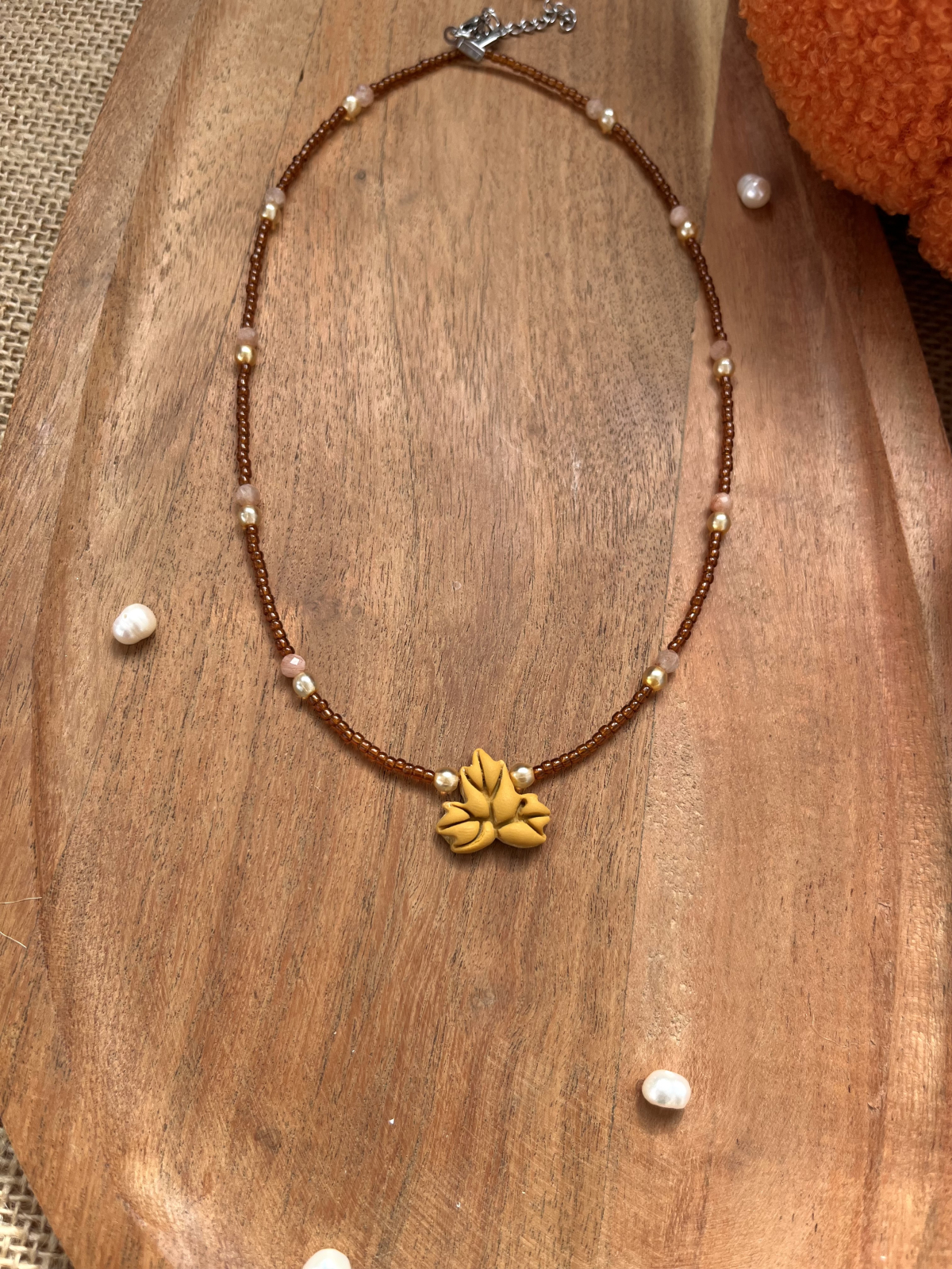 Colier handmade cu frunzuliță delicată, margeluțe Toho maro și piatra soarelui – cozy și elegant pentru toamnă.