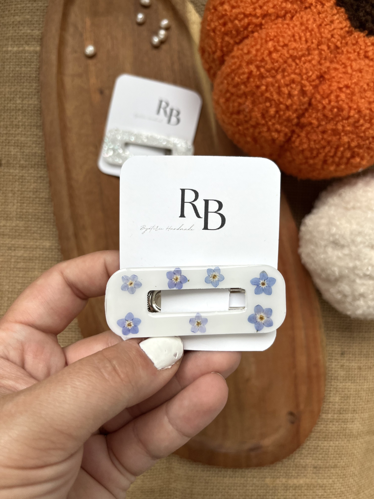 Agrafe de păr handmade din rășină, disponibile în 3 variante cozy: maro cu sclipici, alb cu sclipici și alb cu flori „Nu mă uita” – perfecte pentru un look tomnatic delicat.