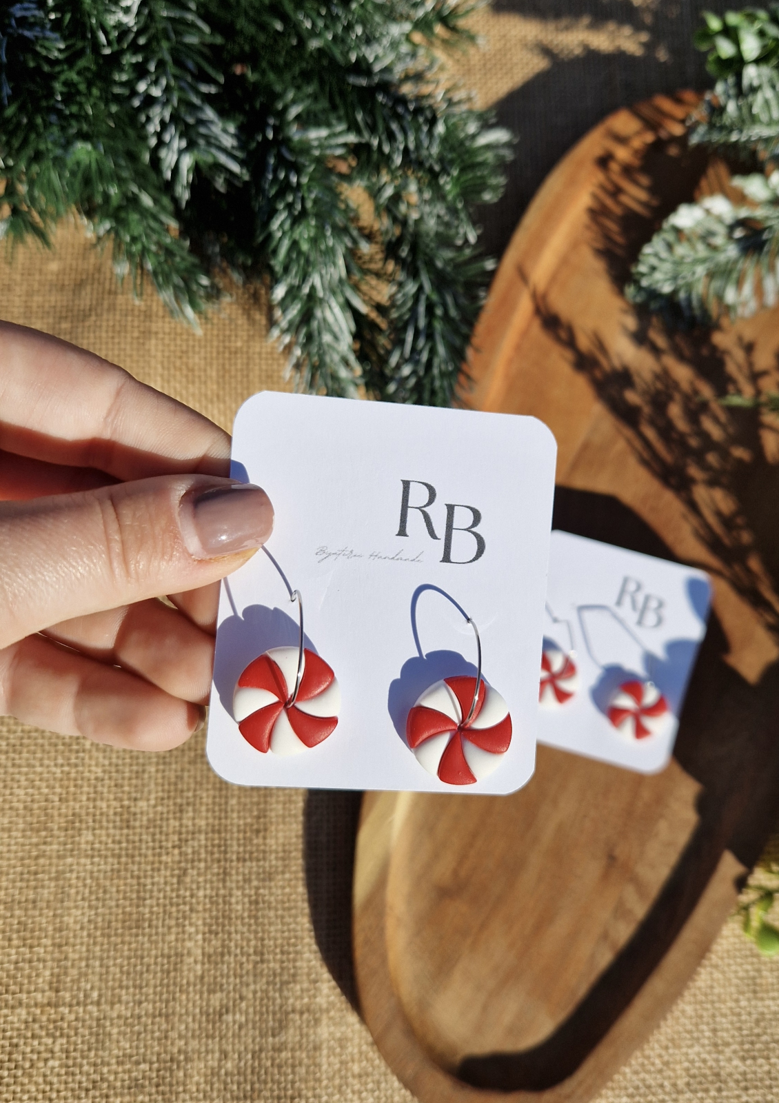 Într-un dulap mic de dulciuri, două bomboane alb-roșii și-au dorit să pornească într-o aventură și să aducă zâmbete celor care le poartă. Legate cu grijă de hook-uri rotunde și rectangulare, ele se leagănă ușor la fiecare mișcare, aducând cu ele magia sărbătorilor și amintirea copilăriei când aroma bomboanelor plutea în aer.