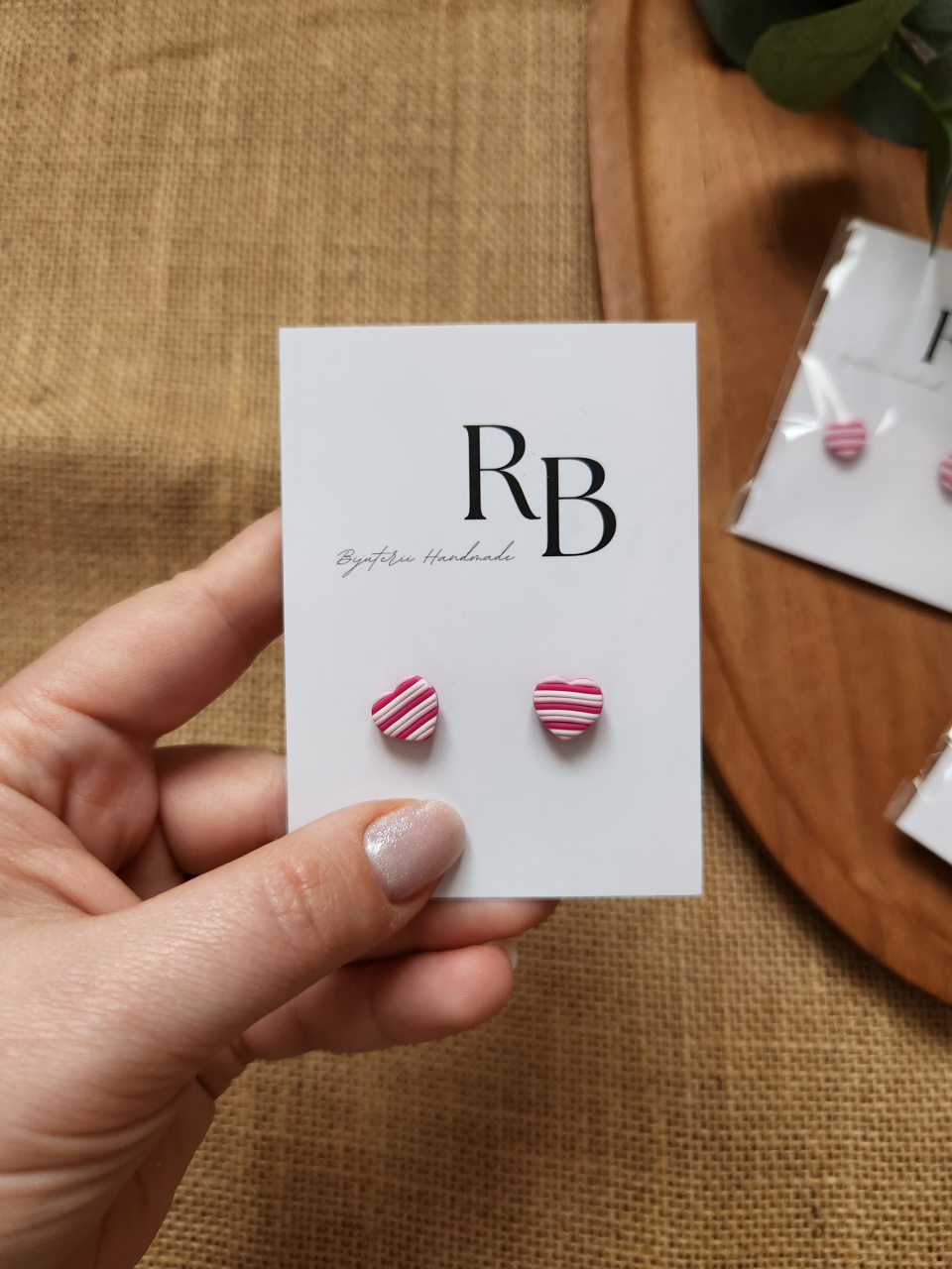 Acești cercei stud adaugă un strop de culoare și veselie ținutelor tale. Fiecare inimioară este modelată manual din lut polimeric, cu dungi contrastante în nuanțe de roz, pentru un efect jucăuș și delicat. Prinderea tip stud îi face confortabili și siguri la purtare, iar dimensiunea mică îi face versatili, perfecți pentru purtare zilnică sau layering cu alte cercei mici.